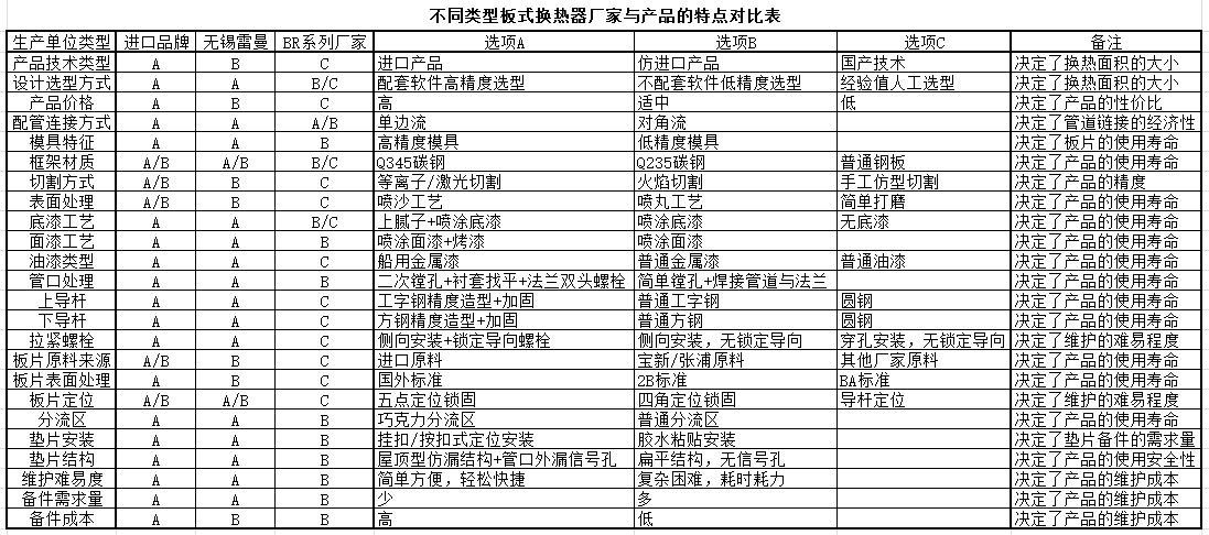 誤區五:拿著甲換熱器廠家的設計方案與圖紙或者是產品要求乙換熱器廠家進行報價。出于比價的目的,很多客戶都會拿著某一家換熱器廠家的產品設計方案、圖紙、產品數據甚至僅僅是一個產品型號就要求另外的廠家進行報價,有時候還會要求比價單位提供的產品的尺寸、換熱面積必須和其他單位完全一致。實際上,由于每個換熱器生產廠家的生產與營銷定位、產品板型來源、產品規格性能、產品命名規則、設計選型能力、生產制造的能力、推薦習慣等眾多因素不可能完全一致,就已經決定了相同的換熱器設計工藝工況不可能出現完全一樣的產品設計方案,產品價格也受產品用料、產品制造工藝、營銷理念、報價人員的慣性思維模式各種因素的影響而會出現較大的差別。比如仿阿法拉伐的產品與仿GEA的產品在產品型號規格上就會出現巨大的不同,仿進口品牌的產品與老舊板型的產品在換熱面積上也會出現巨大的差異。同樣類型產品廠家的同樣換熱面積的產品,板片厚度0.5mm與0.6mm的產品就會存在差異,拉緊螺栓帶鎖定導向裝置與不帶鎖定導向裝置的產品價格也有差異,框架結構采用噴漆工藝與烤漆工藝的產品價格也不可能進行價格比較。板式換熱器作為一種非標設備,除非生產的產品板型來源一致、生產的產品規格數據一致、產品用料一致,生產工藝一致,設計軟件一致,比如采用仿進口品牌產品的廠家的產品可以與其仿制的進口品牌的產品進行產品互換和價格比較。否則任何生產單位都不可能按照其他單位的產品規格與數據進行產品型號的確定和進行產品報價。而且,很多時候換熱器生產廠家在設計方案中都會刻意不去體現板型特征與板片組合方式,其他單位僅憑已知的資料,有時候很難判斷板型和板片組裝方式這一至關重要的產品數據,只能憑借經驗去判斷,很容易因判斷者的個人經驗原因而產生錯誤。因此,明智和正確的做法應該是采購者提出準確的產品技術標準要求,提出統一的設計工況數據,讓換熱器廠家自行選型和報價并提供詳細的設計方案與圖紙以及產品的優勢制造工藝特點,采購者通過這些資料對報價單位的產品類型和特點進行分類,相同類型的單位,相同檔次的產品才可以進行比較和評判。很簡單的舉例,任何的產品都會有高中低檔的差別,他們的性能和售價會存在巨大的差別,拿桑塔納去和奇瑞QQ比價格,或者拿桑塔納去和奔馳GLK比性能,肯定都是沒辦法比的。我們推薦采用產品技術特征對比表格的方式來對板式換熱器的生產廠家和產品進行綜合評判(見附件表格,僅供參考)